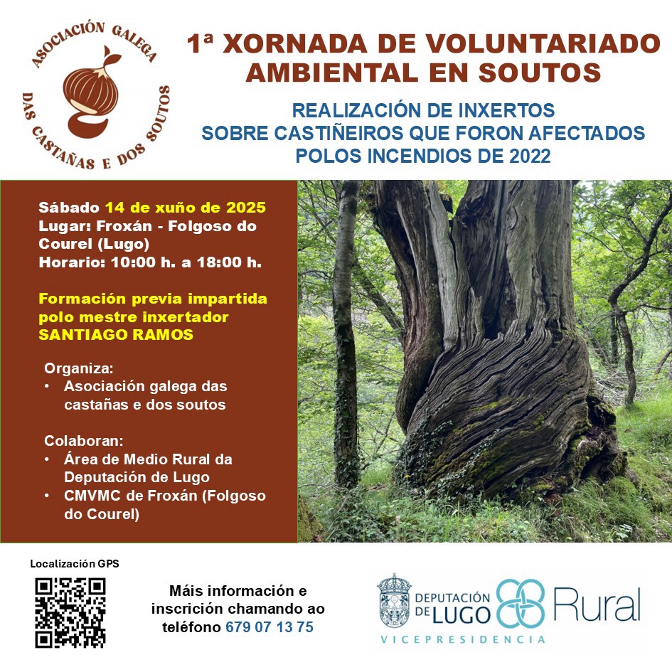 A “1ª Xornada de Voluntariado Ambiental en Soutos” é unha actividade formativa e práctica dirixida á recuperación de castiñeiros danados polos incendios de 2022 na zona de Froxán, Folgoso do Courel (Lugo). A xornada inclúe unha formación previa impartida polo mestre enxertador Santiago Ramos, e celebrarase o sábado 14 de xuño de 2025, de 10:00 a 18:00 h.