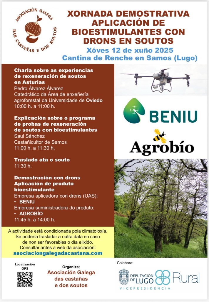 A Asociación Galega das Castañas e dos Soutos celebrará o vindeiro xoves 12 de xuño unha demostración en campo do uso de drons (UAS) para a aplicación de tratamentos con bioestimulantes sobre castiñeiros.